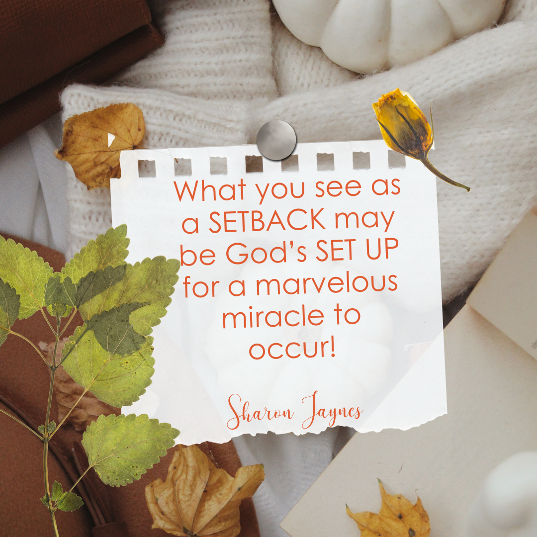 Dear God, I’ll admit that sometimes I get so discouraged I feel like I can’t go on. When things don’t go the way I thought they would, I just want to quit. Help me to remember that my greatest setbacks might be one of Your incredible setups for marvelous miracles to occur. Give me the God-confidence that I need to keep moving forward in Your will. In Jesus’ Name, Amen.